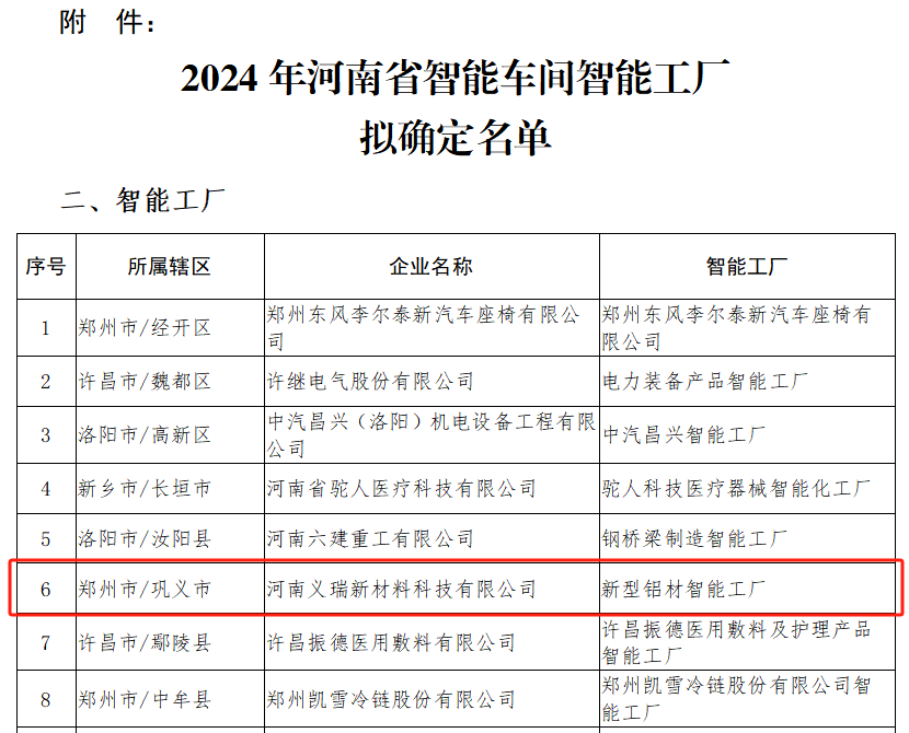 根據《河南省加快數字化轉型推動制造業高端化智能化綠色化發展行動計劃(2023—2025年)》(豫政〔2023〕32號)、《河南省制造強省建設領導小組辦公室關于印發2024年河南省加快數字化轉型推動制造業高端化智能化綠色化發展工作方案的通知》(豫制造強省辦〔2024〕13號)、《河南省工業和信息化廳辦公室關于開展2024年制造業數字化轉型示范遴選工作的通知》(豫工信辦〔2024〕30號)等文件要求,經主管部門審核,明泰鋁業下屬子公司河南義瑞新材料科技有限公司新型鋁材智能工廠被評為“2024年河南省智能工廠”。