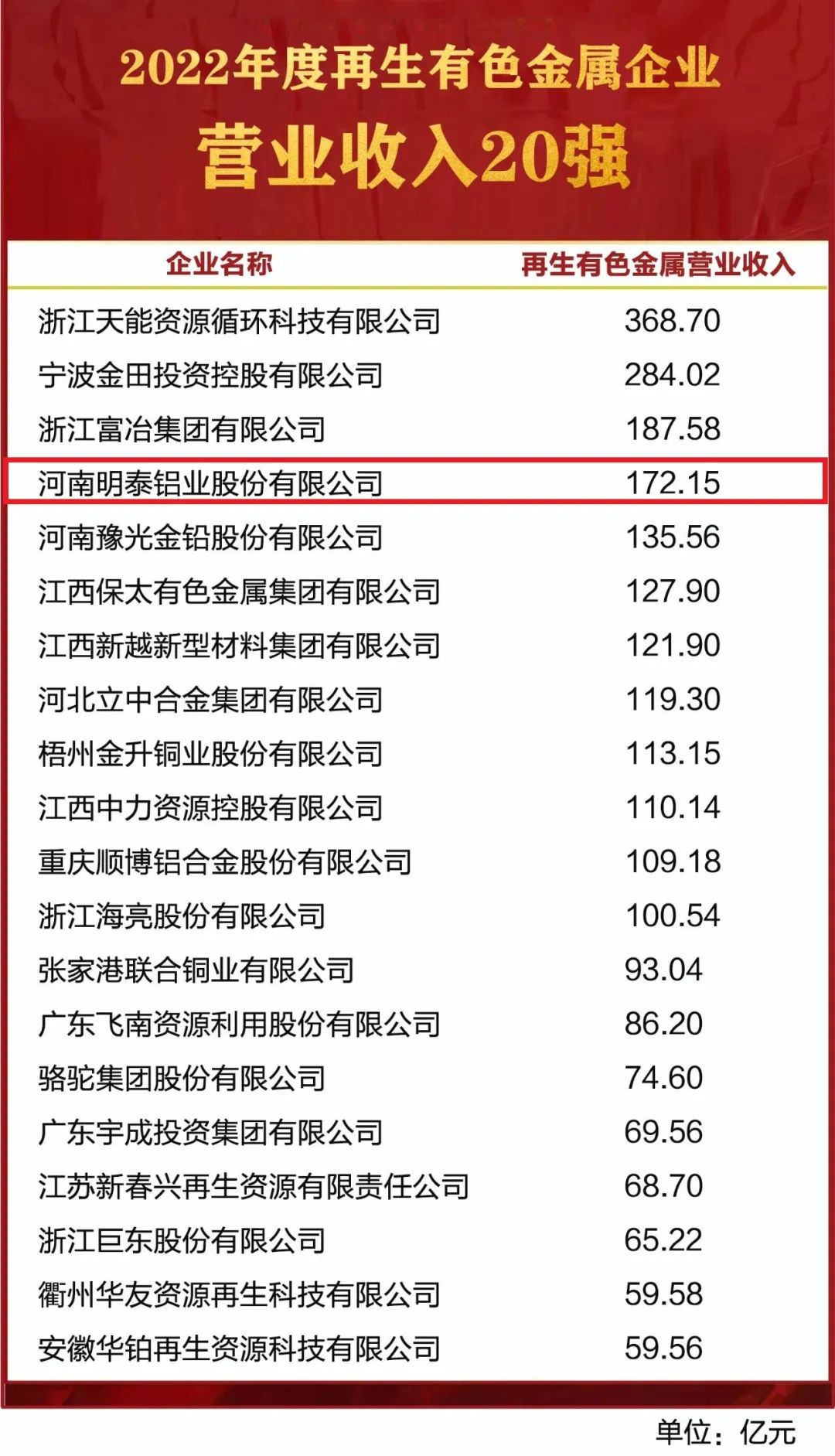 近日,中國再生金屬協(xié)會發(fā)布2022年度再生有色金屬企業(yè)營業(yè)收入20強名單,明泰鋁業(yè)再次上榜!